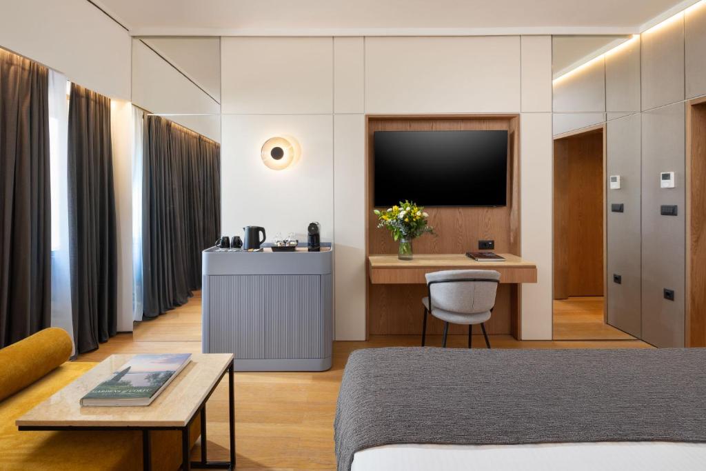 ホテルは良い場所にあり、コルフ旧市街から徒歩数分の距離です。バス停はホテルのすぐ外にあり、観光用のホップオンホップオフバスも利用できます。近くにはスーパーマーケットやレストランがあります。施設は良好で(プール、ビーチへのアクセス、スパ)、スタッフもフレンドリーです。ホテルは古く、改装が必要ですが、最初の数泊は古い部屋に滞在することになり、それほど良くありませんでした。しかし幸運なことに、最後の夜は5階のアップグレードされた部屋に滞在できました。