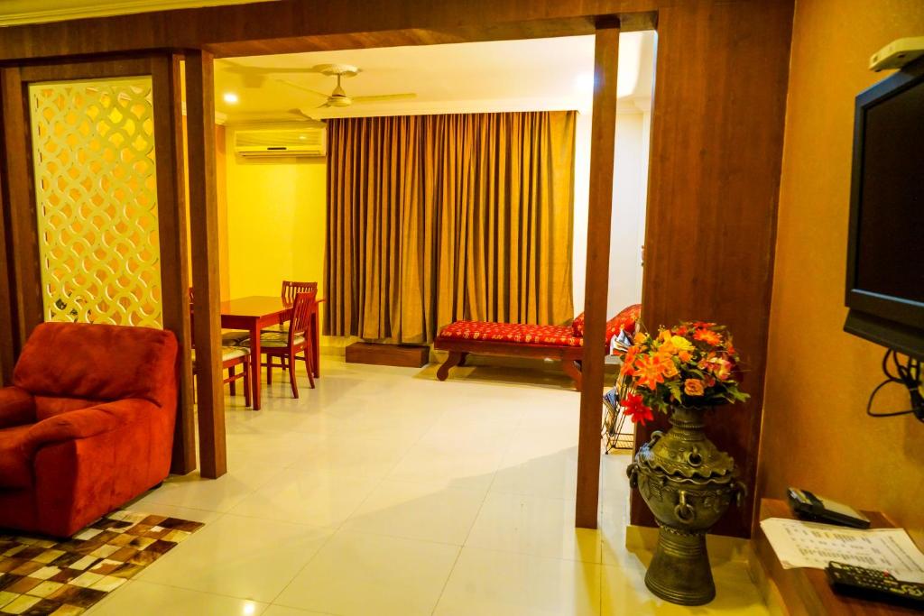 このホテルは、グルヴァユール寺院の「テッケ・ナダ」南門のすぐ近くに非常に便利に位置しています。家族と一緒に訪れる場合には素晴らしい滞在場所です。部屋はとても清潔で広さも十分です。スタッフはとても歓迎してくれ、快適です。特に受付のジャヤスリーさんは、部屋の必要なものを非常に迅速に手配してくれました。もし欠点を挙げるとしたら、レストランです。メニューの選択肢が限られており、価格もやや高めです。ホテルから徒歩5分のところにあるキザッケ・ナダ(東門)の周辺には、もっと良い食事の選択肢があります。全体として、とても快適で満足のいく滞在でした。