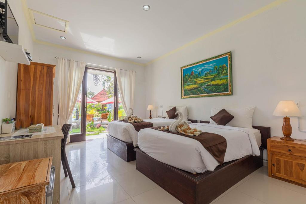 The grounds are lovely and all the rooms separate into into own little joglo. They’re nice. With mosquito nets around the bed. A kettle and a fridge. They provide water and towels for the pool. The staff are very friendly and accommodating. We had a slight problem with our room. The shower once turned on would not turn off. However the staff were quick to come and fix the problem.