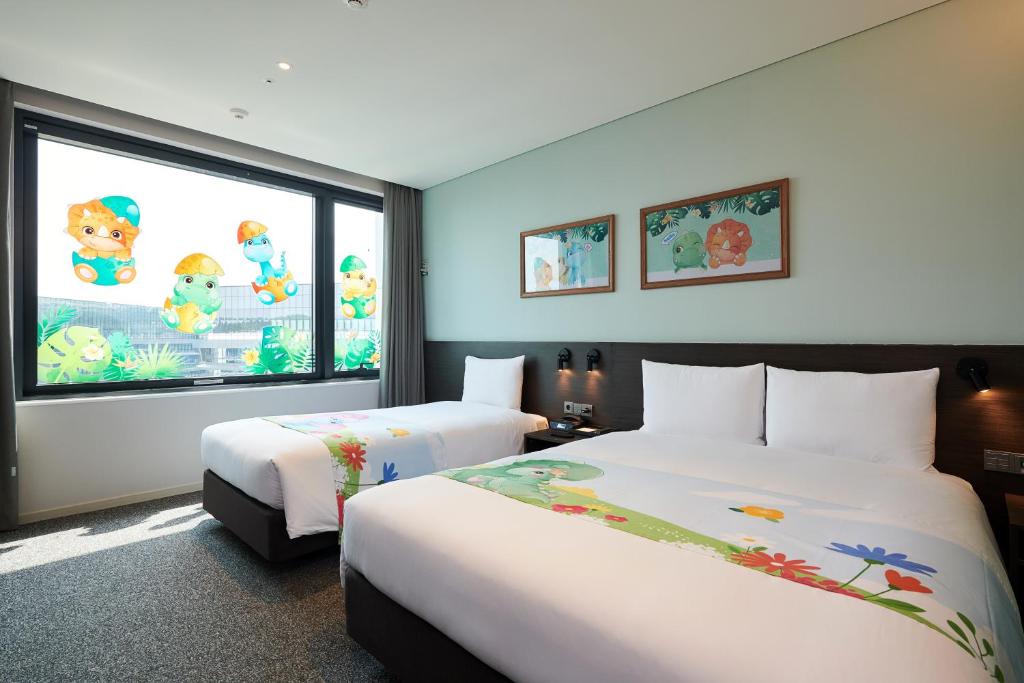 恐竜の絵が印刷された布が壁に掛かっていて、フォトゾーンとして使うことができ、布団の上にも印刷された布が置かれており、ステッカーで飾られているので子供たちはとても喜んでいました。大人には「お~、う~」という程度で終わりましたが、子供たちはとても楽しんでいて、ホテルに戻る時間になると恐竜部屋に行こうと言っていました。きれいに整頓されていて、プールも利用できるので非常に良かったです。安全要員が常にいるので心も休まりました。全てのスタッフが親切でした。ホテル周辺に何もないのは欠点ですが、ファミリースモールでほとんどのことができるのは利点です。楽しい旅行になりました。次の機会があればまた泊まりたい場所です。