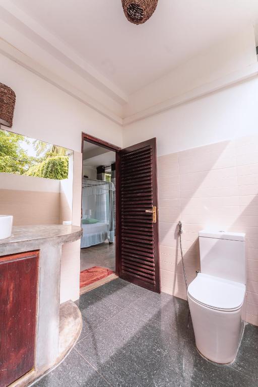 Beautiful beach right next to the beach. Nice pool for our kids. The room was very clean and beautiful decorated. The food in the restaurant at top was excellent. Our kids loved the food at the hotel. Friendly stuff, especially Anouk has a lot of tips for trips around Dickwella. The surf spot is great! Overall a perfect stay.