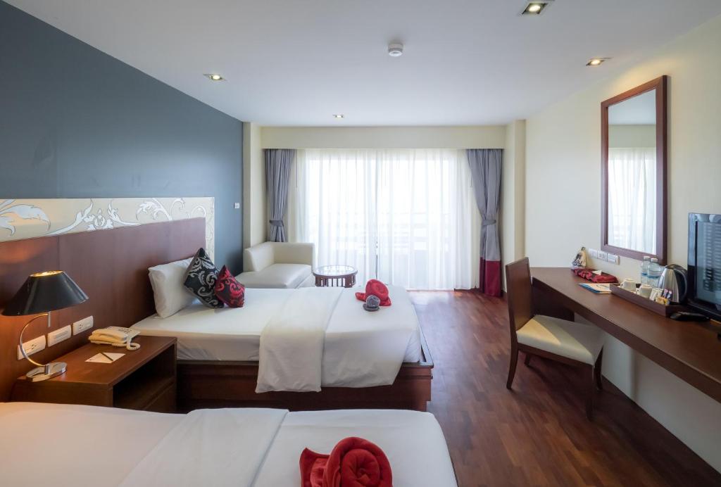 海に近い宿泊施設で、通りを渡ればすぐに海で遊んだり、砂浜を散歩したりできます。食事は普通で、良かったです。部屋は使えましたが、水の出がちょっと強すぎました。 プールは大きくて、遊ぶのにたくさんのスペースがあります。4階には小さなプールもあり、遊ぶことができますが、プールサイドの席は少なめです。お客様のほとんどは外国人で、タイ人は少なかったです。外国人のお客様はタオルを置いてプールサイドの椅子を予約していることが多く、最初は私たちはそれが使えると思っていましたが、40分後に外国人から、自分のタオルで席を予約していると言われました。 全体的に見て、宿泊施設は良かったです。おすすめです。海で遊んだり、砂浜を散歩するのに便利です。 歩行者専用道路で鳥や木を観賞しながら、店舗も便利に利用できます。