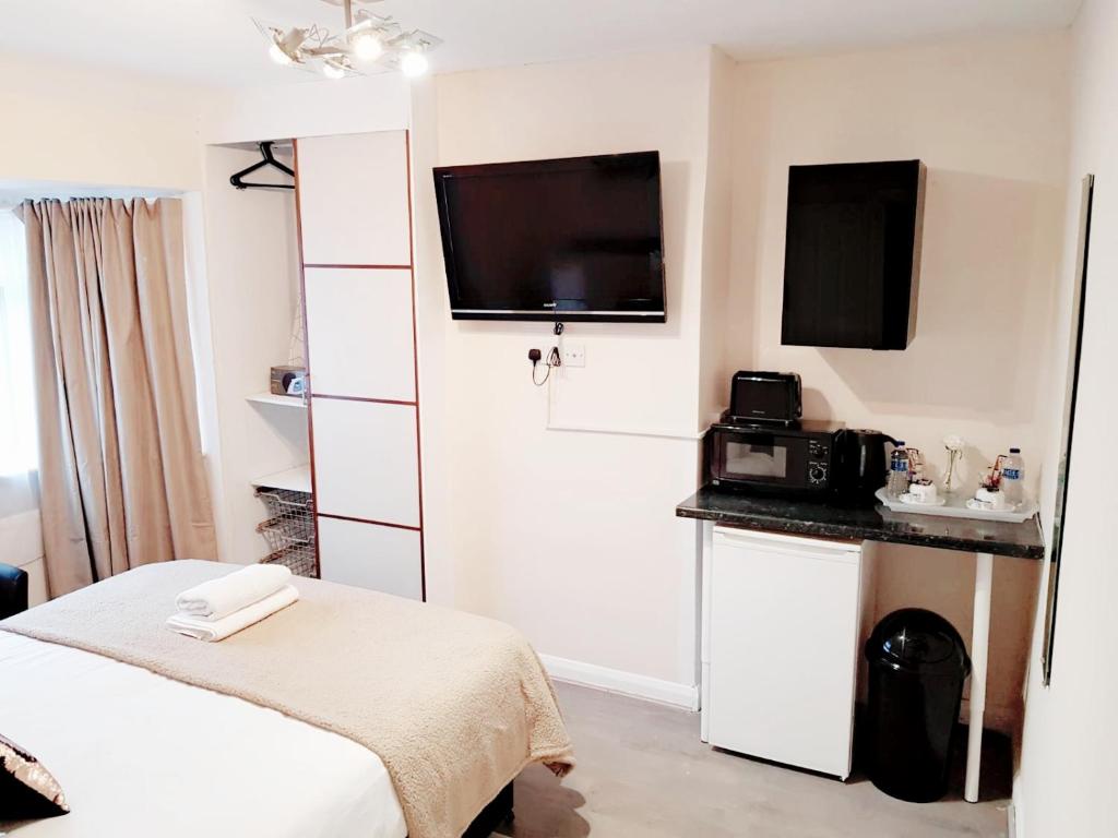 必要なものがすべて揃った素敵な部屋で、冷蔵庫、電子レンジ、ケトル、テレビがあります。快適なベッドと専用バスルームも完備しています。お勧めします。