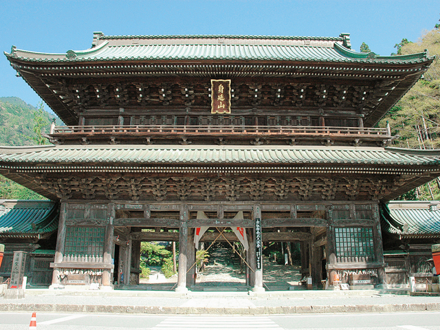 日蓮宗の総本山。文永11年(1274)に日蓮聖人が山中に庵を構えたのが始まりで、後の文明6年(1474)に日朝上人が大伽藍を現在の地に移転。門前通りから巨大な三門を抜けて境内に入り、287段の石段・菩提梯を上りつめた山の中腹に豪壮な堂宇が立ち並ぶ。ほとんどが明治の大火後の再建だが、格式を感じさせる建物ばかり。平成20年(2008)には五重塔が復元建立。大本堂横からロープウェイで上がった身延山頂は日蓮が父母を偲び、ふるさと南房総の方向を眺めるため登頂した場所。手植えのスギと伝わる巨木が林を作り、富士山・駿河湾の眺めも楽しめる。祖師堂前の樹齢約400年のシダレ桜も見事だ。