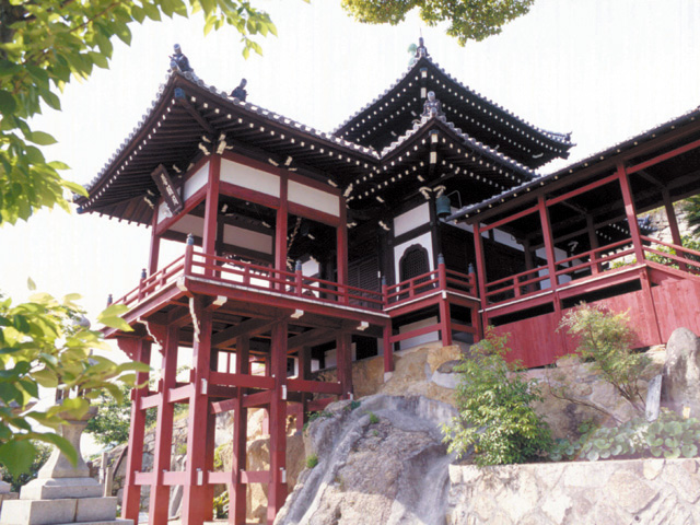 町並み保存地区の中央、本町通りから入った石段の上にある浄土宗の寺・西方寺の境内南側に立つ、舞台造の観音堂。京都の清水寺を模して宝暦8年(1758)に建てたといわれ、十一面観音像が安置されている。高台にあり楼上からは、竹原の家並みを一望することができる。