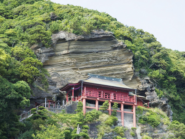 地元では崖の観音として親しまれるように、観音堂は舞台造で、船形山中腹の断崖に、朱塗りの堂が張り付くように立っている。行基により養老元年(717)に開基され、関東大震災後、大正14年(1925)に再建された。堂の奥には行基が漁師の安全と豊漁を祈願して刻んだとされる高さ1.5mの磨崖仏がある。