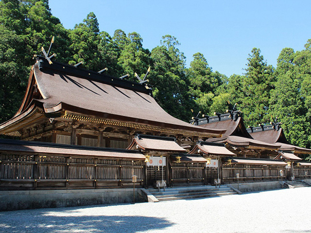 熊野三山のひとつ。鳥居をくぐって158段の石段を上ると、神門の向こうに四社殿が立つ。左から夫須美大神を祀る西御前(第一殿)、速玉大神を祀る中御前(第二殿)を合わせた相殿、その右隣に熊野造の証誠殿が立ち、主祭神の家津御子大神[けつみこのおおかみ]を祀る本殿となっている。さらに右隣の若宮(第四殿)には天照大神が祀られている。伝承によると、社殿創建は今から2020年ほど前の崇神天皇の時代。500m下流の大斎原[おおゆのはら]に鎮座していたが、明治22年(1889)の大洪水で一部社殿が流失し、現在の地に移築された。令和3年(2021)11月現在、宝物館は閉館中。