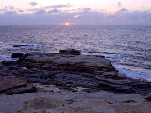 湯崎の南約1km、瀬戸崎の先端にある新生代第三紀中新生の大きな白い岩盤。柔らかい砂岩でできているため、長年の荒波の浸食によって石畳ならぬ岩畳のような地形が造り出された。広い岩畳は、何層もの階段状になっているので、容易に先端の波打際まで歩いて行ける。風の強い日は波が岩に砕け散って豪快。夕景もまた美しい。