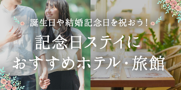 旅先で恋人やパートナーと過ごす記念日は、良い思い出が作れるように、いつものデートより贅沢をして最高の一日にしませんか。誕生日や結婚記念日、子供のお祝い、長寿祝いなど、特別な日は記念日旅行を。アニバーサリーにとっておきの宿泊で大切な人と素敵な思い出を作ろう。