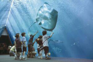 親潮と黒潮が出合う「潮目の海」をテーマに約800種の生物を展示する環境水族館。シンボルである大水槽の巨大な三角トンネルでは頭上をさまざまな魚たちが泳ぎ、まるで自分が海の中にいるかのよう。生き物と触れあう体験も人気です。