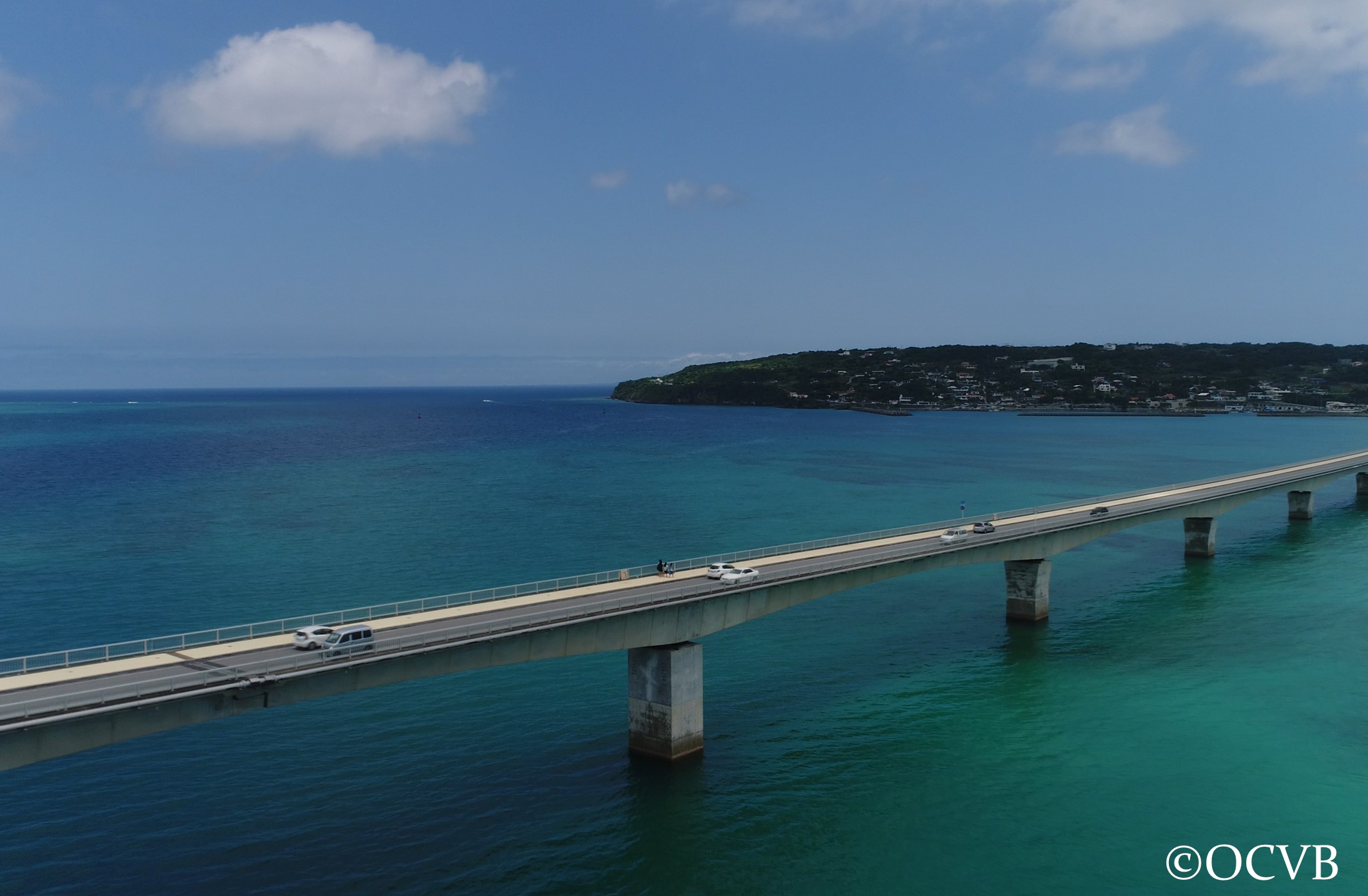 古宇利大橋は今帰仁村(なきじんそん)の古宇利島と名護市の屋我地島を結ぶ全長1,960mの橋です。2005年2月8日に開通し、県内では通行無料の橋としては2番目に長い橋になります。 橋の両側には本島屈指のきれいなエメラルドグリーンの海が広がり、絶景のドライブコースとなっています。また、古宇利島は別名「恋島」と呼ばれ、カップルに人気がある島です。島の北側にはCM撮影にも使われたハートの形をした「ハートロック」も人気のスポットです。 干潮時には歩いてハートロックに近づくこともできます。