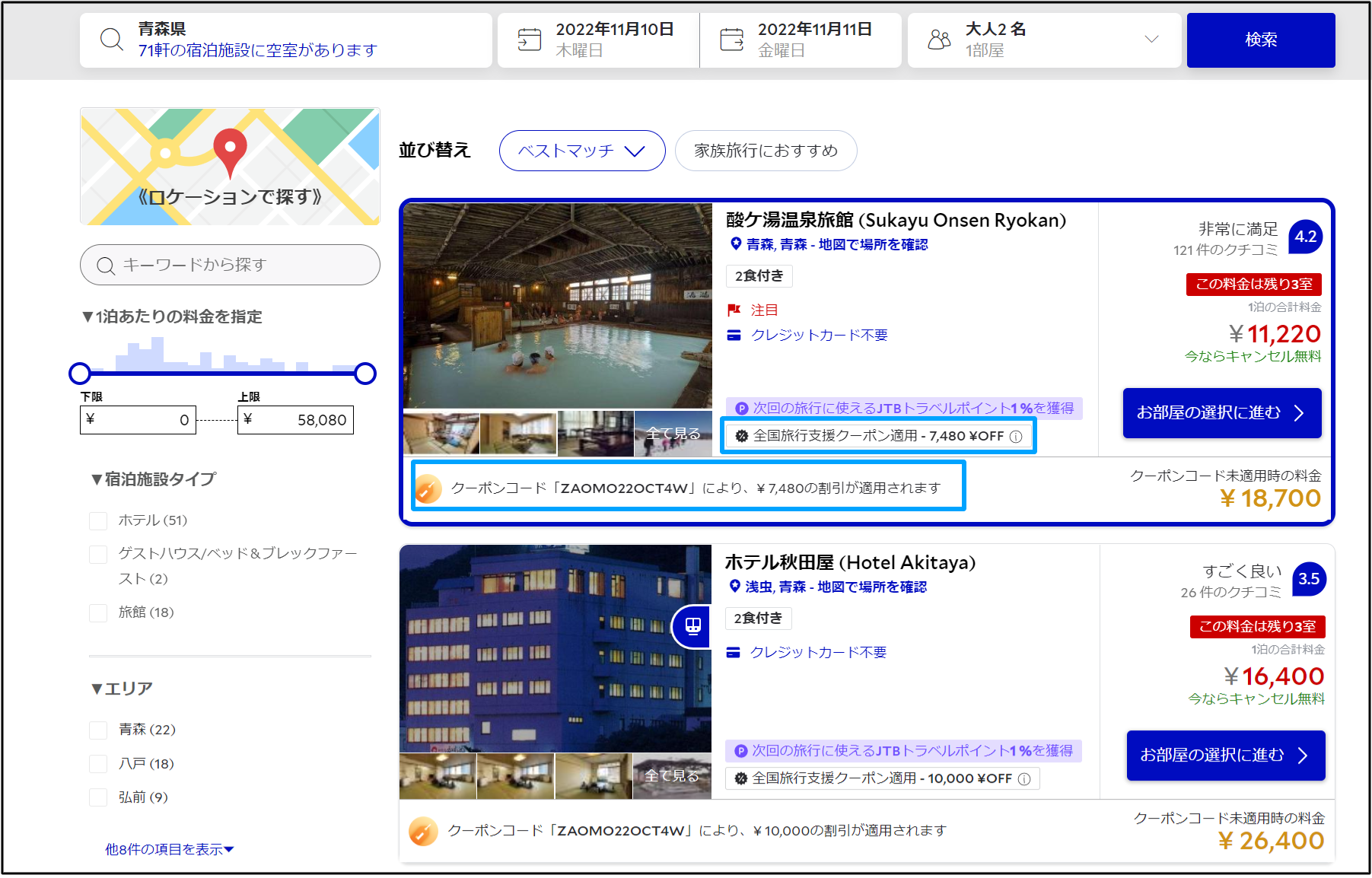 宿泊施設一覧ページで全国旅行支援クーポン対象施設をご確認いただけます。(※以下の画面はご参考用のクーポン一例です。)