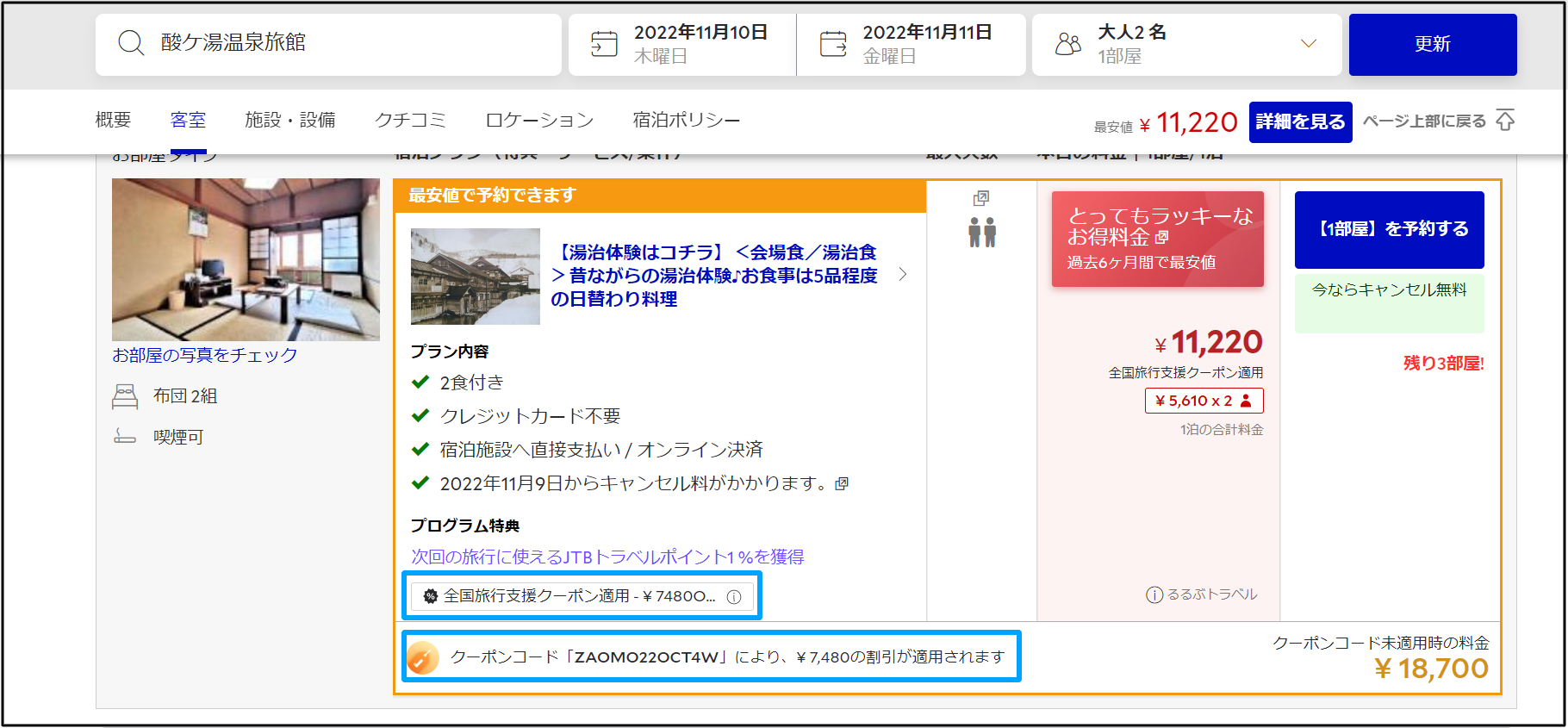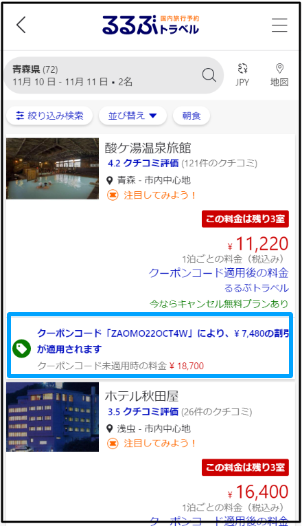 るるぶトラベルならクーポンが自動でセット!割引がすぐ分かる!