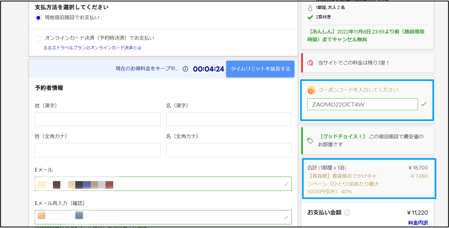 予約入力画面の「クーポンコード」が入力されていることをご確認後、予約を完了すればOK!